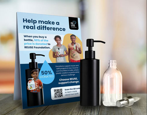 The UK’s “Bottles for Good” campaign from UK charity REUSE Foundation, in collaboration with refill stores and mobile refill services, aims to inspire citizens to embrace refill culture and reduce single-use plastic waste. Participating stores receive free refillable bottles; the stores donate 50% of the proceeds to the charity to fund its work supporting reuse and female-empowerment, including the Beat The Sachet initiative in India. [Image Credit: © REUSE Foundation]